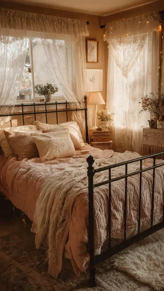 A black iron bed frame creates delicate structure against soft blush or cream bedding. Lace curtains and warm golden lighting add to the dreamy mood. Keep furniture minimal so the bed remains the focal point. Add layered throws and textured pillows to soften the metal frame. This style feels gentle, intimate, and timeless when you keep the palette soft and cohesive.