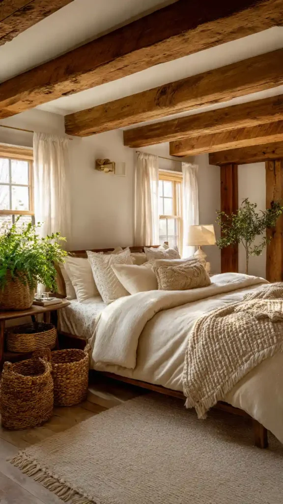 6. Rustic Farmhouse Bedroom with Wood Beams