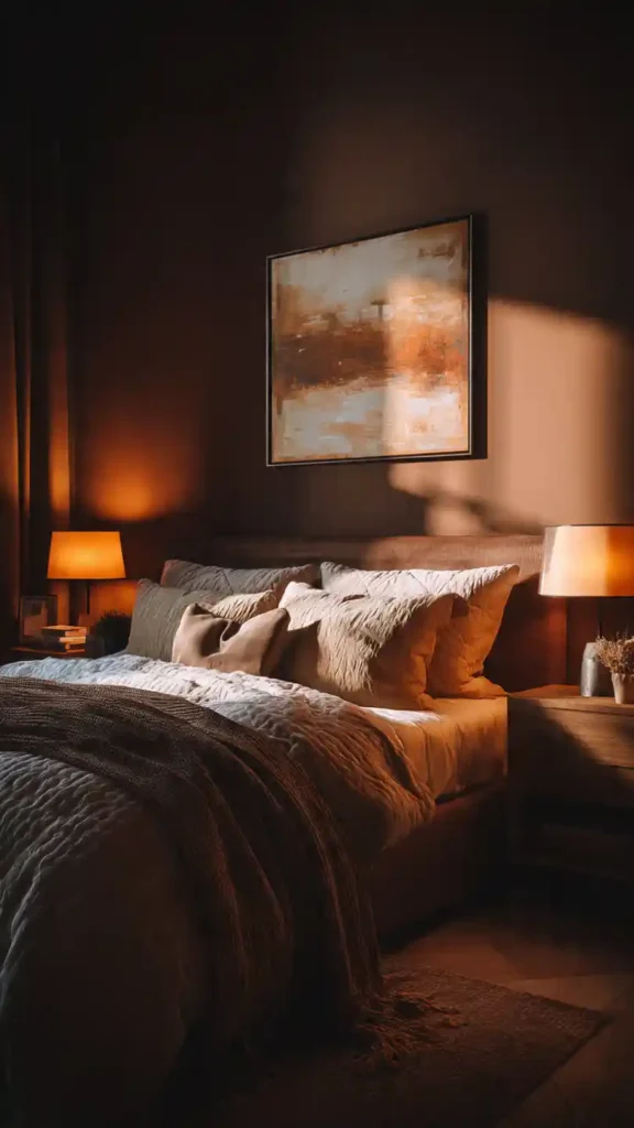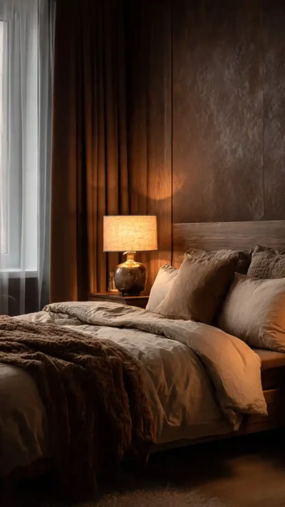 A warm brown accent wall creates depth and richness. Pair it with beige or cream bedding to maintain balance. Wood furniture enhances the earthy palette and keeps the space grounded. Use soft lamp lighting rather than overhead fixtures for a relaxed atmosphere. Add a plush rug to prevent the darker tones from feeling too heavy. The result is comforting and inviting.