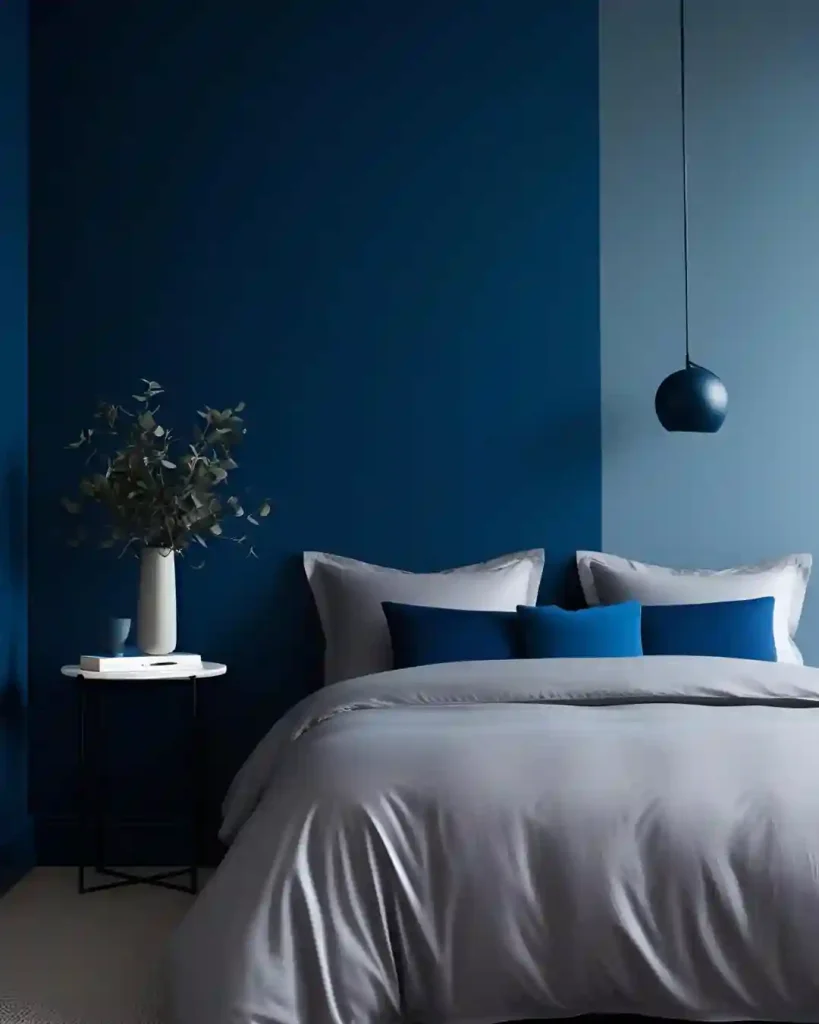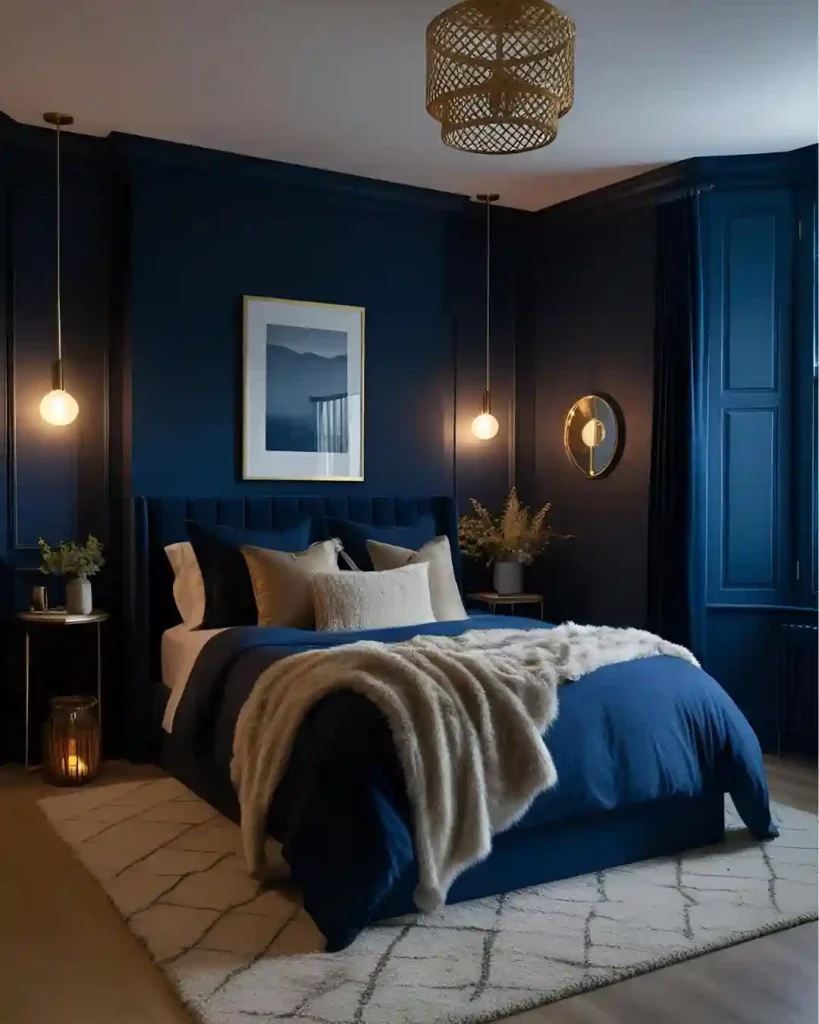 Are you thinking about making your bedroom more cozy and stylish? Dark blue is a perfect color choice! It feels calm like the night sky but also looks very fancy.