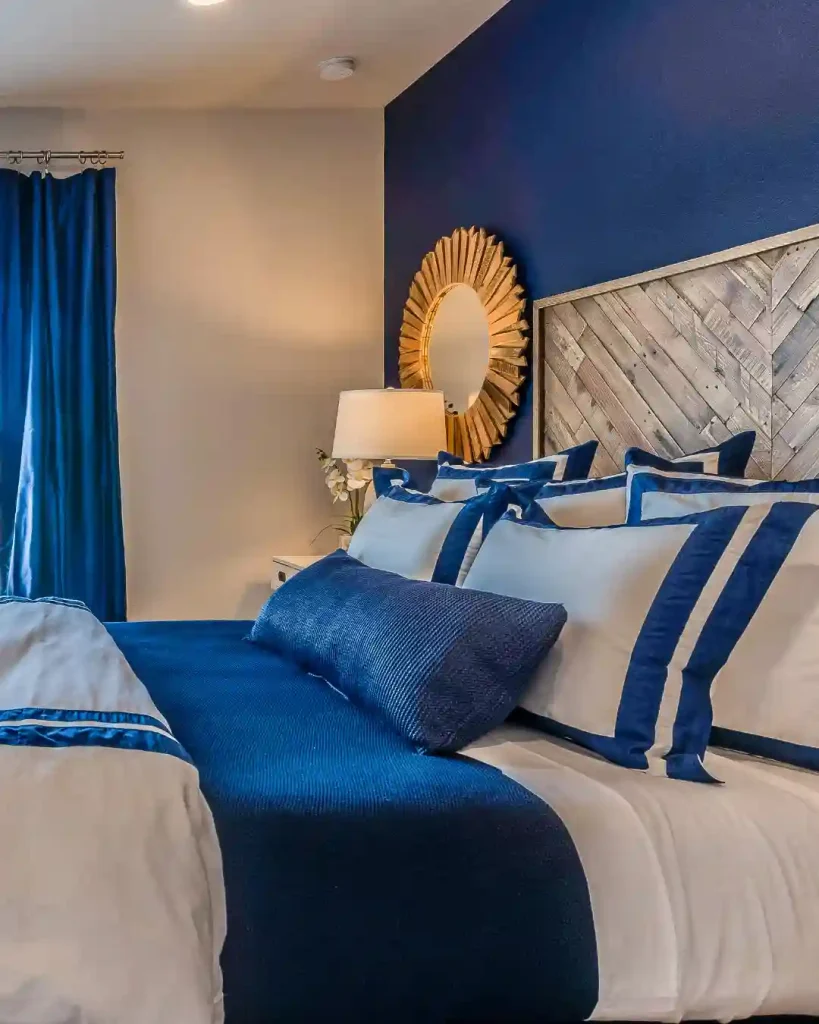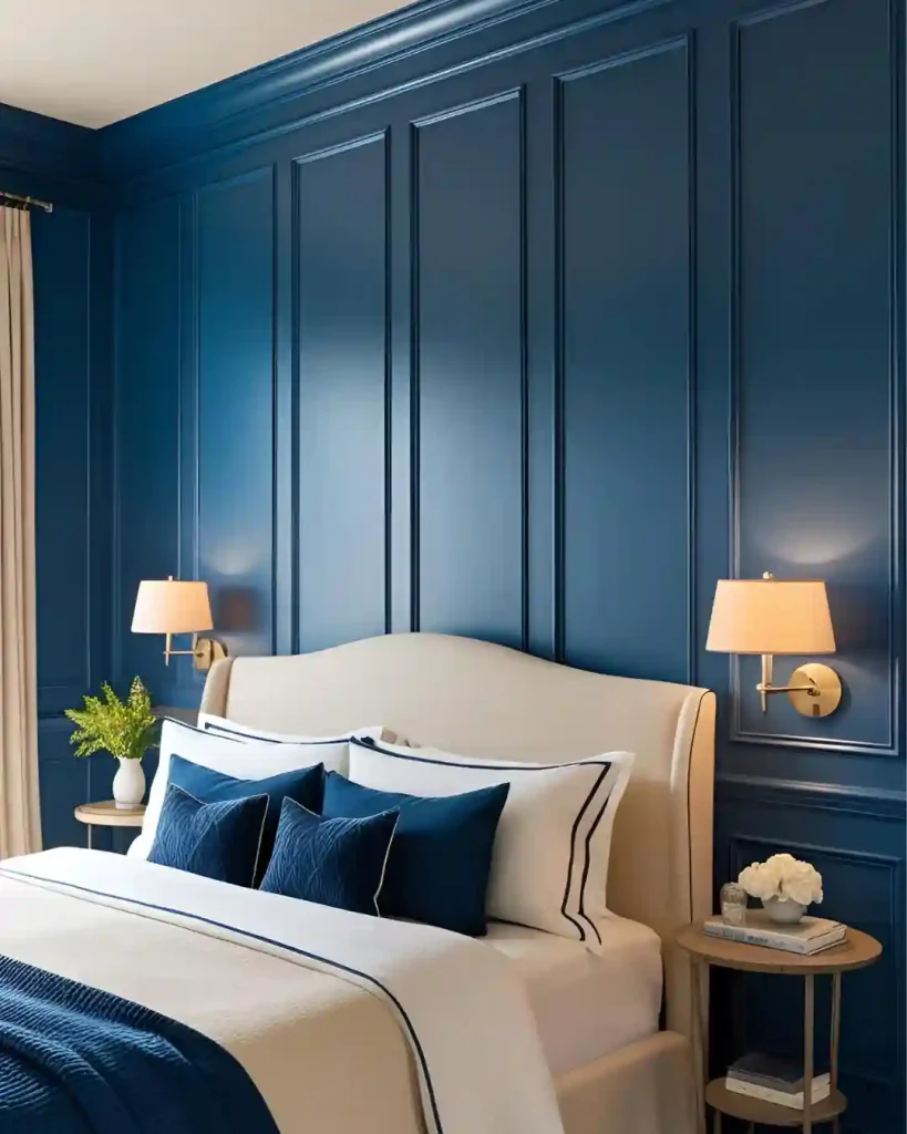 Want your bedroom to feel like a luxury hotel? Pair dark blue with gold for a rich, fancy look that never gets old.