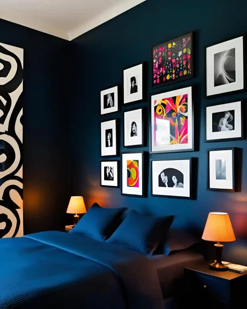 Dark blue walls make the perfect background for a collection of framed art or photos.