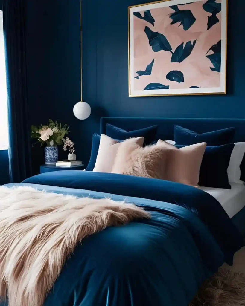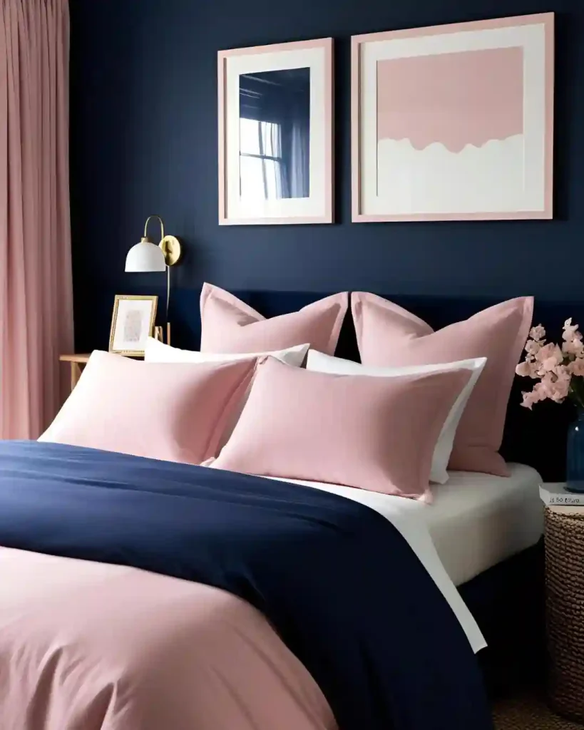 How to style it: Use dark blue as your main color for walls or large furniture, then add blush pink in bedding, pillows, or a cozy chair. Add brass or gold accents to complete the look.