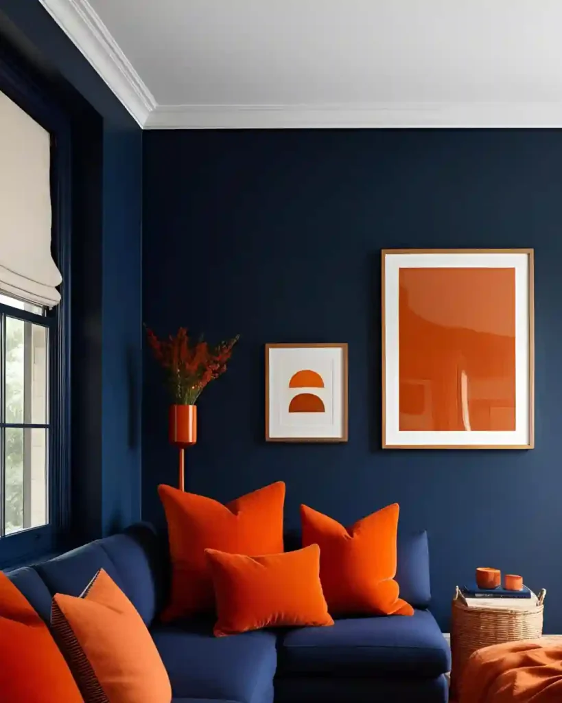 How to style it: Keep your walls and larger furniture blue, then add orange in your pillows, throw blankets, or a small chair. Start with small orange items if you’re unsure.
