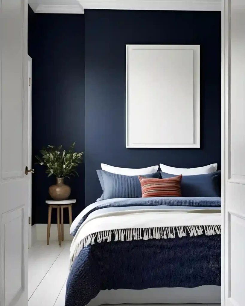 How to style it: Add light-colored bedding with maybe one or two blue pillows that match your wall. A simple wooden headboard looks amazing against dark blue.