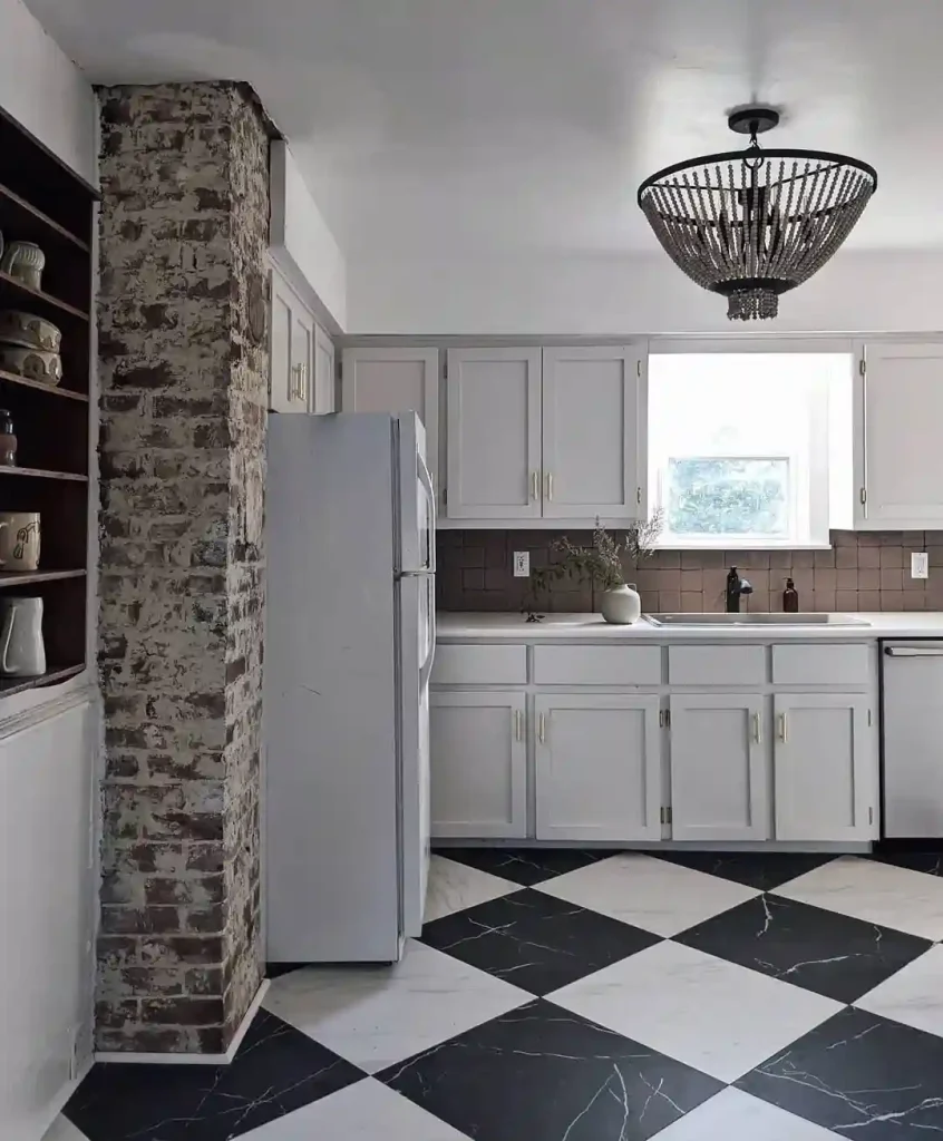 White cabinets paired with deep brown tile and classic checkerboard flooring create a timeless foundation. Raw elements like exposed brick and open shelving add character, while brass hardware and a statement light fixture bring subtle glamour.