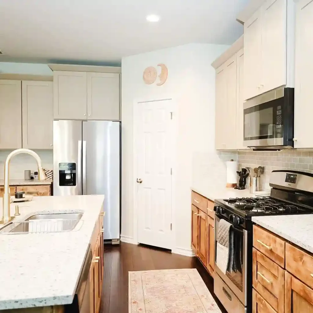 - Two-tone cabinetry (light uppers, warm wood lowers)