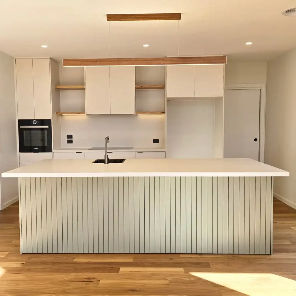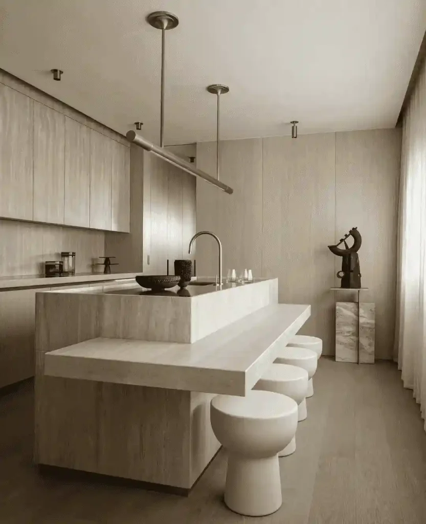 Embracing full-on calm, this kitchen features a seamless, stone-toned palette with a waterfall island that includes an integrated bench. Smooth cabinet fronts, built-in lighting, and muted textures create a spa-like atmosphere that invites you to slow down.