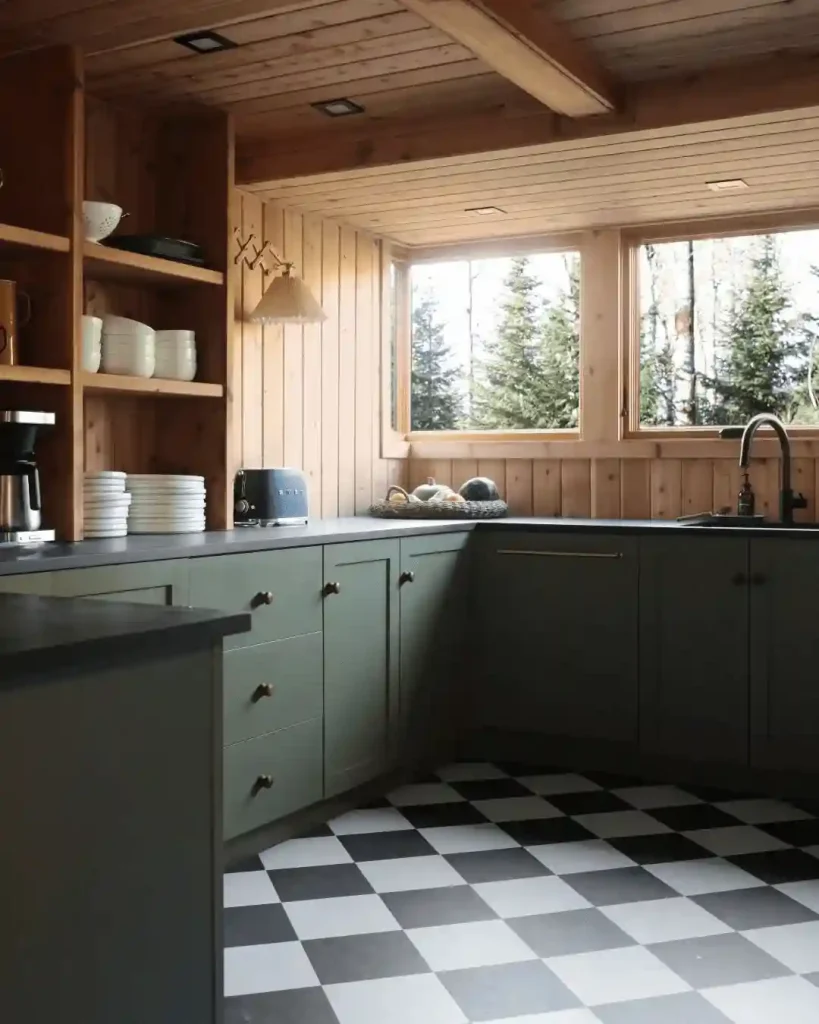 Checkerboard floors paired with sage cabinets and dark countertops create bold yet cozy contrast. Warm wood paneling surrounds the space, reinforcing the cabin feel, while open shelving with stacked dishes and simple lighting keep it both stylish and practical.