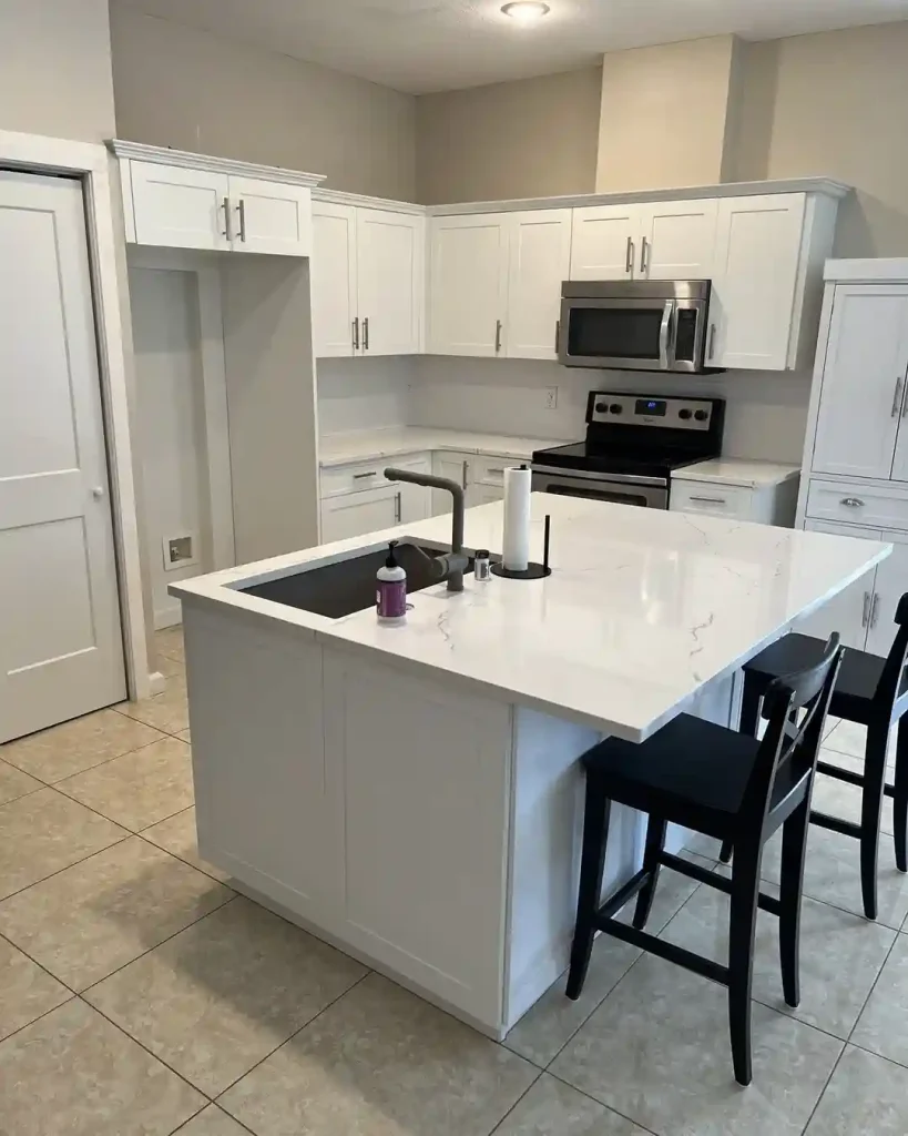 This all-white kitchen proves that simple can be stunning. White shaker cabinets and a central island contrast gently with warm beige walls and tiled floors. Black seating adds depth without disturbing the flow, creating a neat, bright space with classic charm.