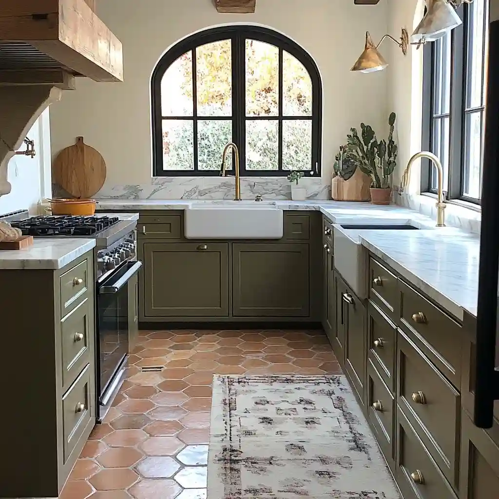 Blending rustic elements with refined details, this kitchen pairs olive cabinets with terracotta floors and marble counters. An arched window and brass finishes add timeless beauty, while plants and warm lighting maintain a relaxed atmosphere.