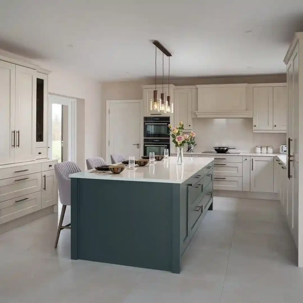 Both calm and captivating, this kitchen combines creamy cabinetry with a deep teal island for subtle contrast. Gold pendant lights and soft blush chairs add warmth and sophistication without losing the cozy, lived-in feel.