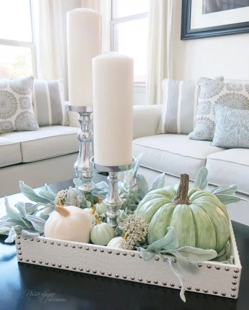 Soft greens and whites steal the spotlight in this bright and elegant coffee table. The silver candleholders and textured tray make everything feel polished, while the mix of pumpkins and lamb’s ear greenery keeps the look calm and seasonal.