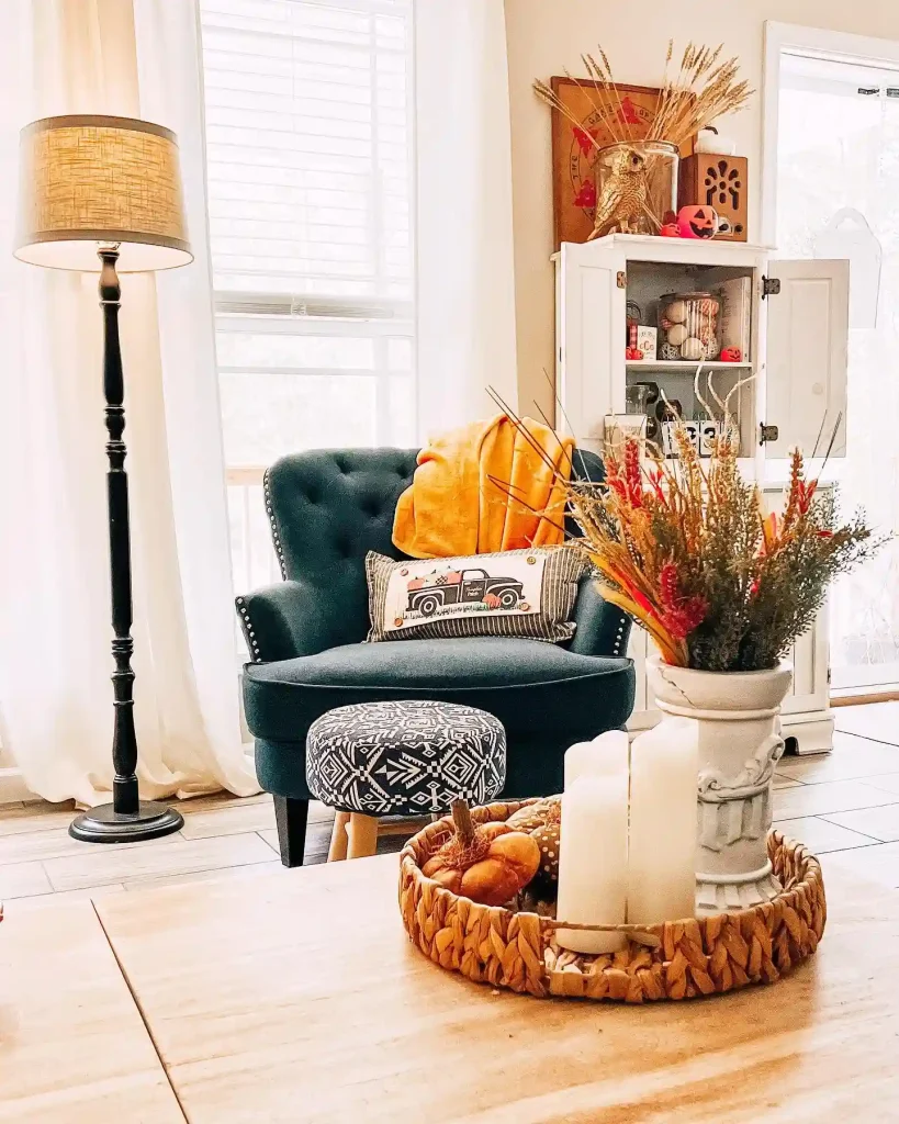 This warm corner setup is full of personality. A basket tray holds candles, pumpkins, and fall florals while a plush teal chair and pumpkin pillow add a cozy, layered feel. It’s the perfect reading nook on a chilly day.