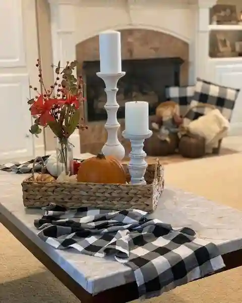Black-and-white plaid meets rustic charm in this warm fall display. A woven tray holds pumpkins, tall white candles, and fall stems for a balanced and layered look. The cozy patterns and soft candlelight make it perfect for autumn evenings.