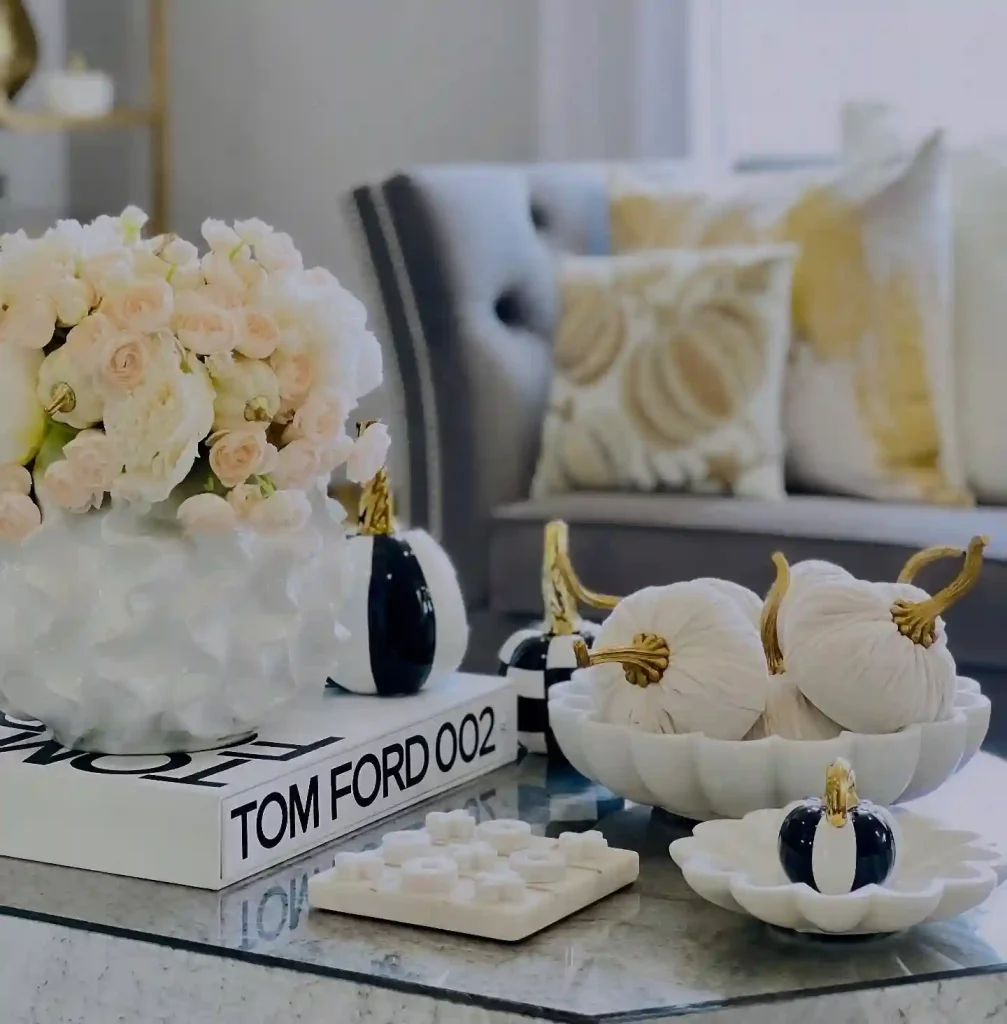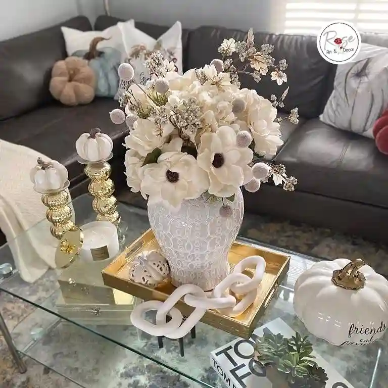 For a touch of luxury, this coffee table mixes creamy florals with black-and-gold pumpkin accents. The soft blush roses and modern white vase add sophistication, while the glossy surfaces and gold details bring warmth. It’s the kind of setup that feels polished yet still welcoming perfect for fall entertaining or slow Sunday afternoons.