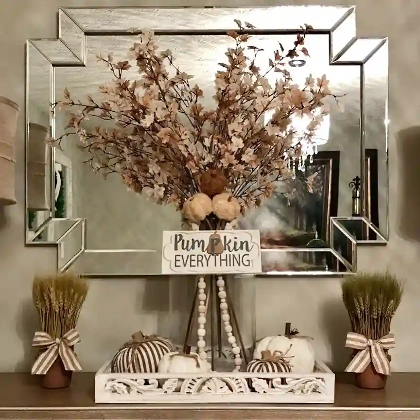 This coffee table feels festive and stylish with its “Pumpkin Everything” sign and tall floral arrangement. Neutral pumpkins and wooden beads sit beautifully in a white carved tray, while matching wheat bundles on each side create perfect balance.
