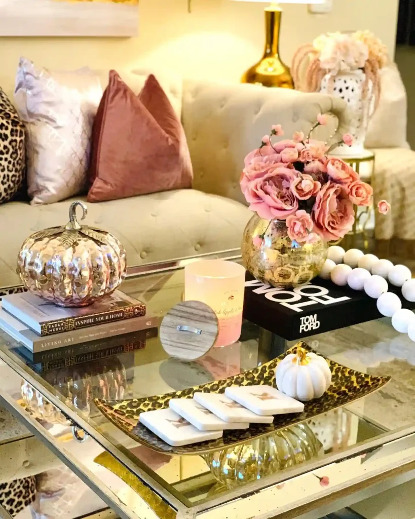 This glass coffee table sparkles with gold and cream tones. A white floral vase sits on a golden tray next to metallic pumpkins and candlelight. The combination feels chic yet cozy — perfect for anyone who loves a touch of glam for fall.