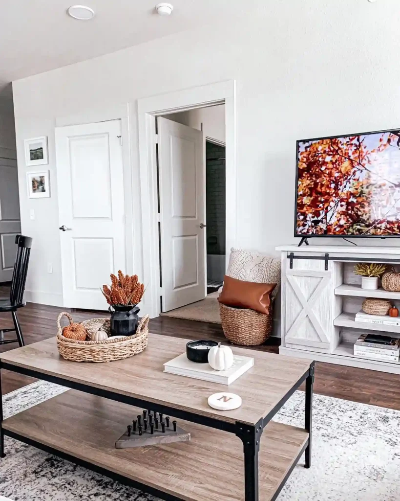 This modern table keeps things clean with a woven basket tray, a small pumpkin, and dried stems in a matte black vase. Paired with neutral furniture and a warm color palette, it’s proof that minimal fall decor can still feel incredibly cozy.