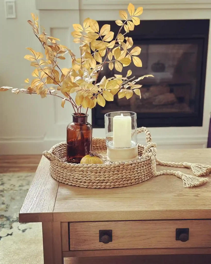 Here, a woven tray adds texture against a clean wood table. A single amber vase filled with golden leaves, paired with a candle and a beaded garland, feels both modern and rustic. It’s a simple, natural way to welcome the season.