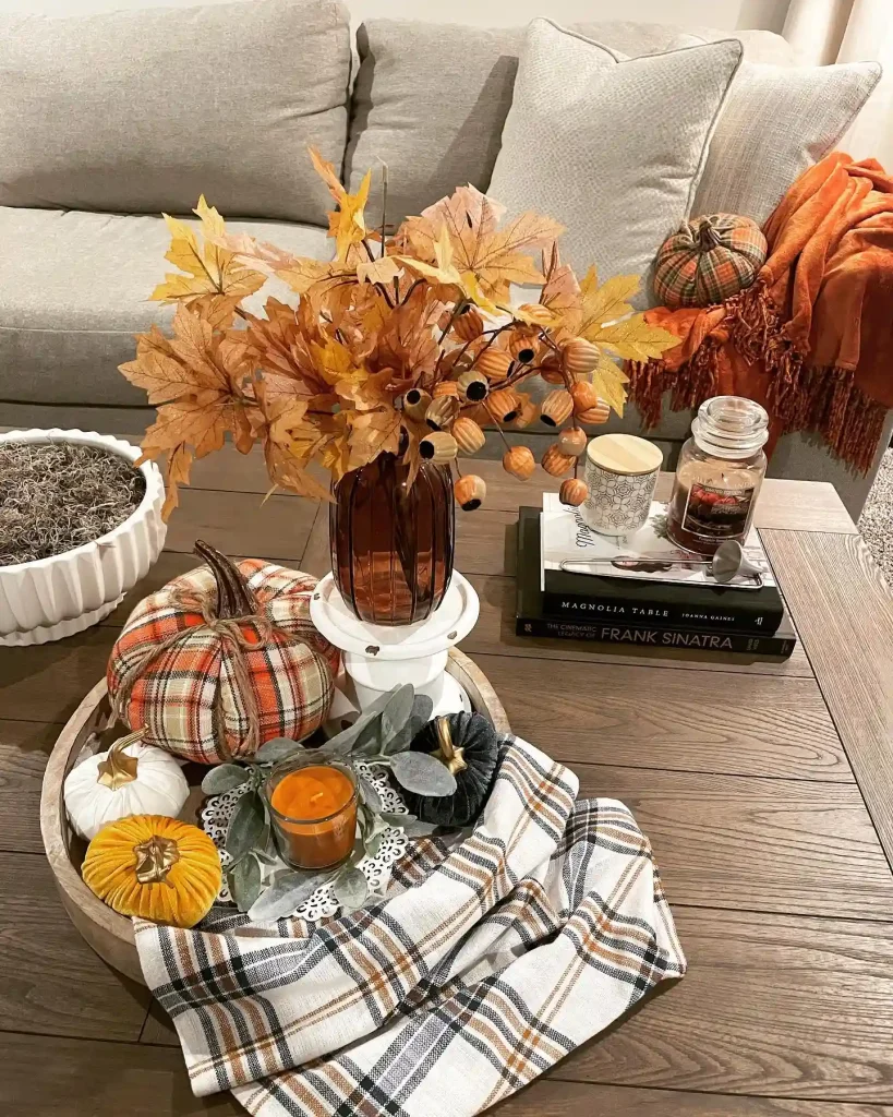 This coffee table decor mixes plaid textures, velvet pumpkins, and amber glass for the ultimate cozy setup. A tray filled with little details — pumpkins, greenery, and a flickering candle — makes the space glow with fall charm.