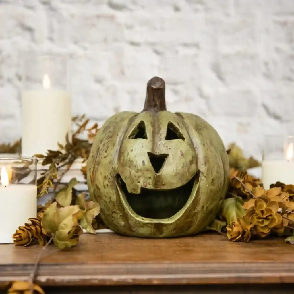 A simple green jack-o’-lantern, surrounded by candles and dried leaves, brings a soft Halloween touch without losing that warm fall feel. It’s charming and playful, yet still cozy enough for everyday autumn decorating.