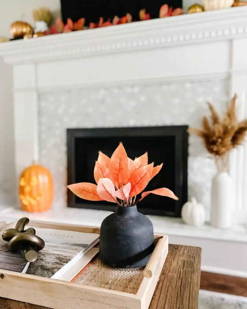 Sometimes, less really is more. A matte black vase filled with bright orange leaves adds a perfect seasonal touch to a clean wooden tray. Paired with cozy textures and a pumpkin by the fireplace, it’s modern, minimal, and effortlessly fall-ready.
