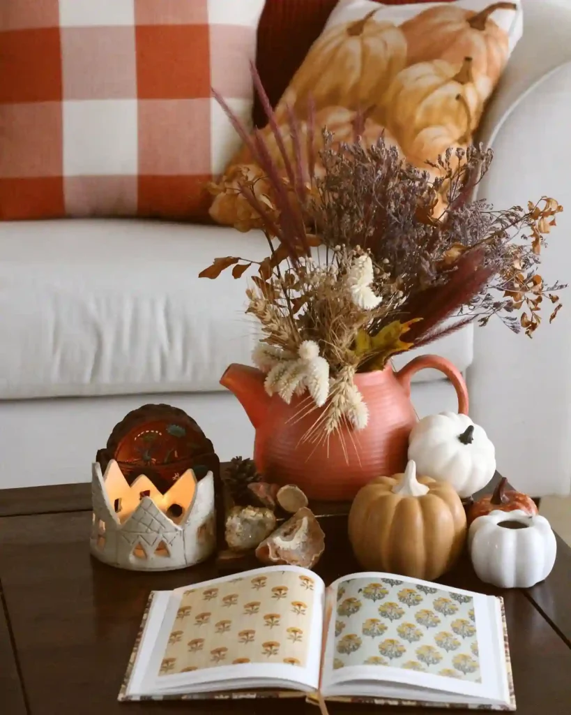A clay teapot filled with dried stems and grasses steals the show in this cozy setting. Surrounded by pumpkins, candles, and an open book, the scene feels lived-in and comforting — like a slow morning in your favorite sweater.