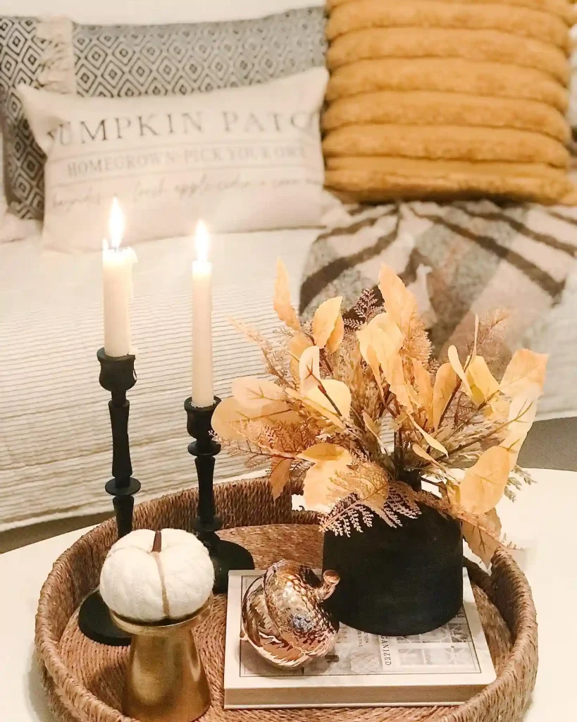 Candles instantly bring warmth. Mix in textures like woven trays, velvet pumpkins, and ceramic vases. Even one or two small decor pieces paired with a soft throw nearby can make the whole area feel more inviting.