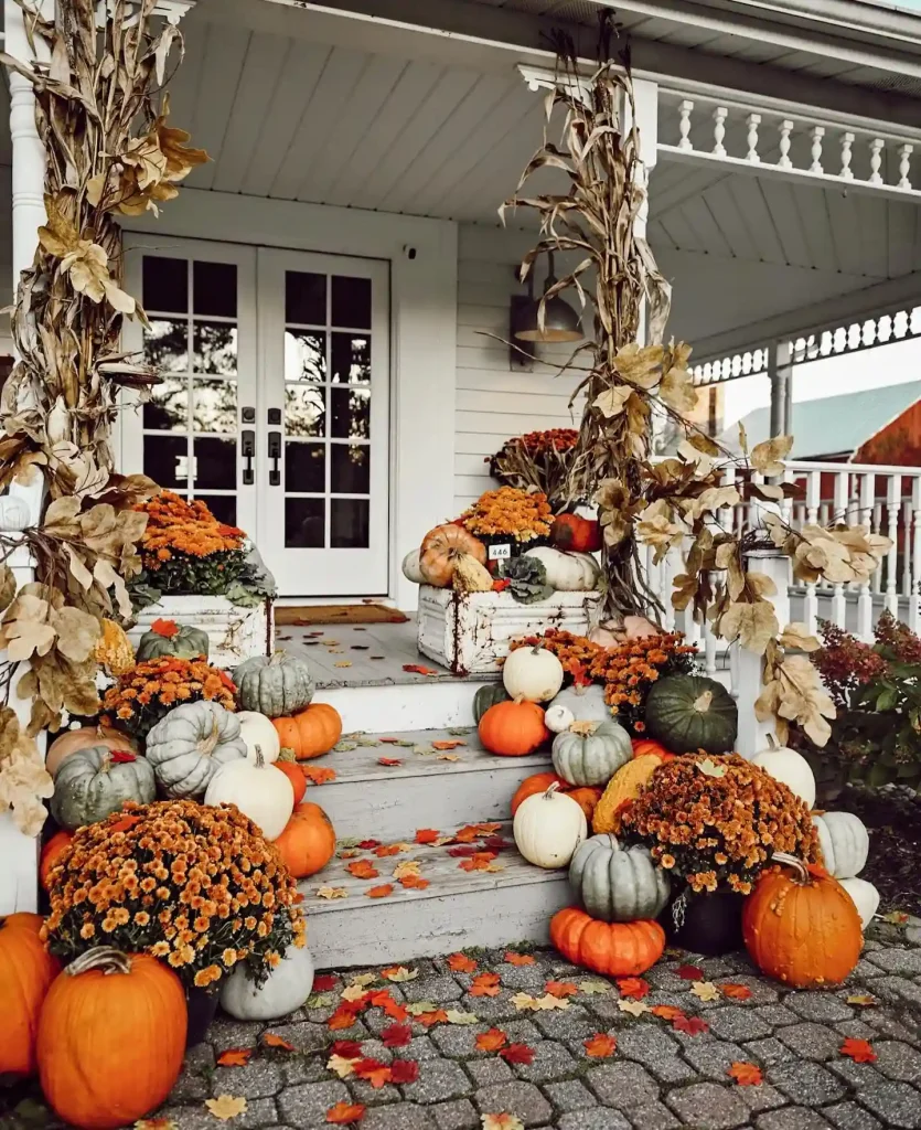 This classic farmhouse porch uses dried corn stalks, pumpkins in varied colors, and deep orange mums to line the steps. Scattered fall leaves tie everything together, creating a timeless autumn entryway.