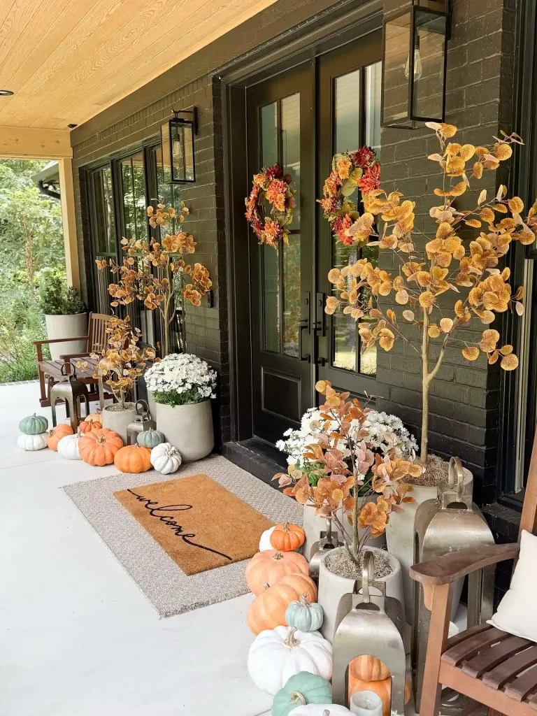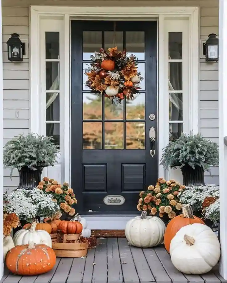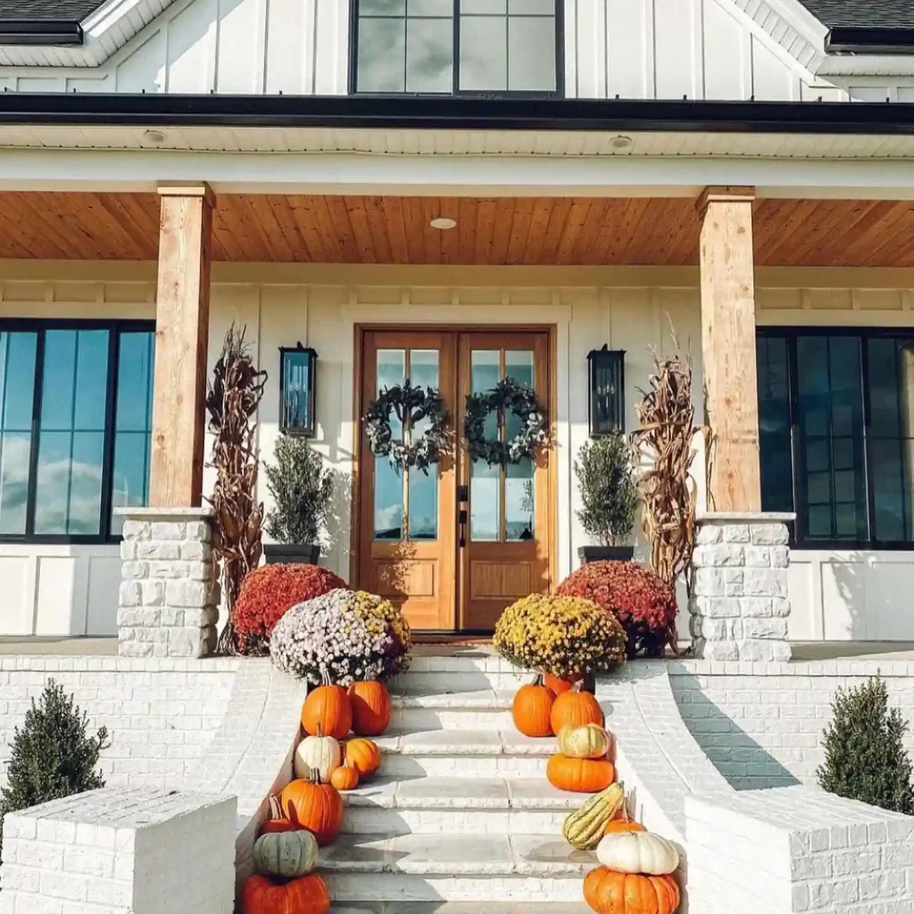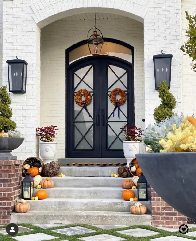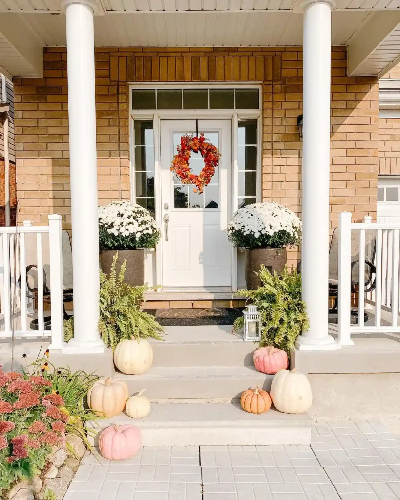 This porch uses a neutral color base—soft grays, creams, and whites—letting the orange pumpkins be the star. Simple wreaths and clean-lined lanterns keep it modern, while the pumpkins scattered on the steps bring in just the right amount of seasonal cheer.