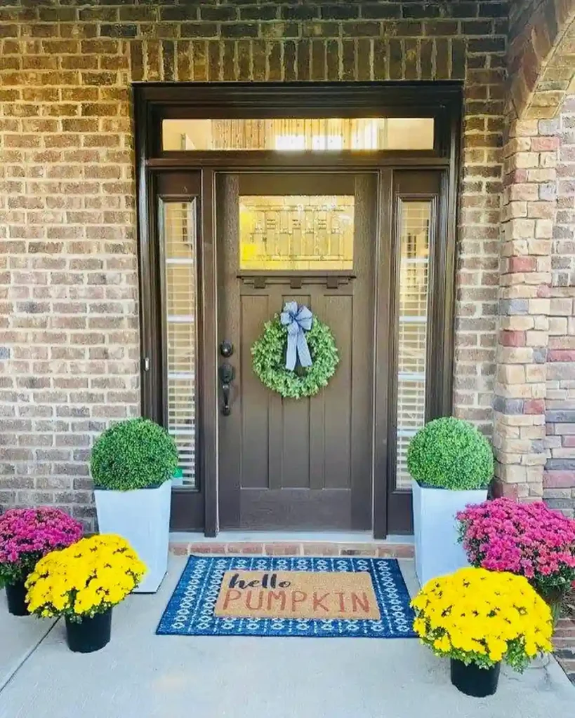A simple brick entry is brightened with a “Hello Pumpkin” mat, clusters of yellow and pink mums, and two neat topiaries. A small wreath with a bow keeps it classic, making the doorway feel fresh and inviting.
