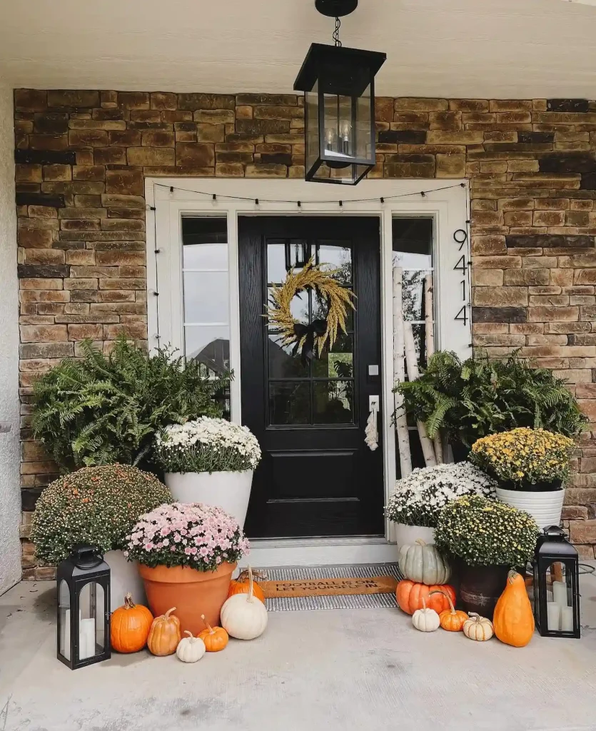 Against a stone façade, this doorway comes alive with layers of mums in warm shades and clusters of pumpkins of all sizes. Black lanterns bring a soft glow, making the entry both welcoming and full of texture.