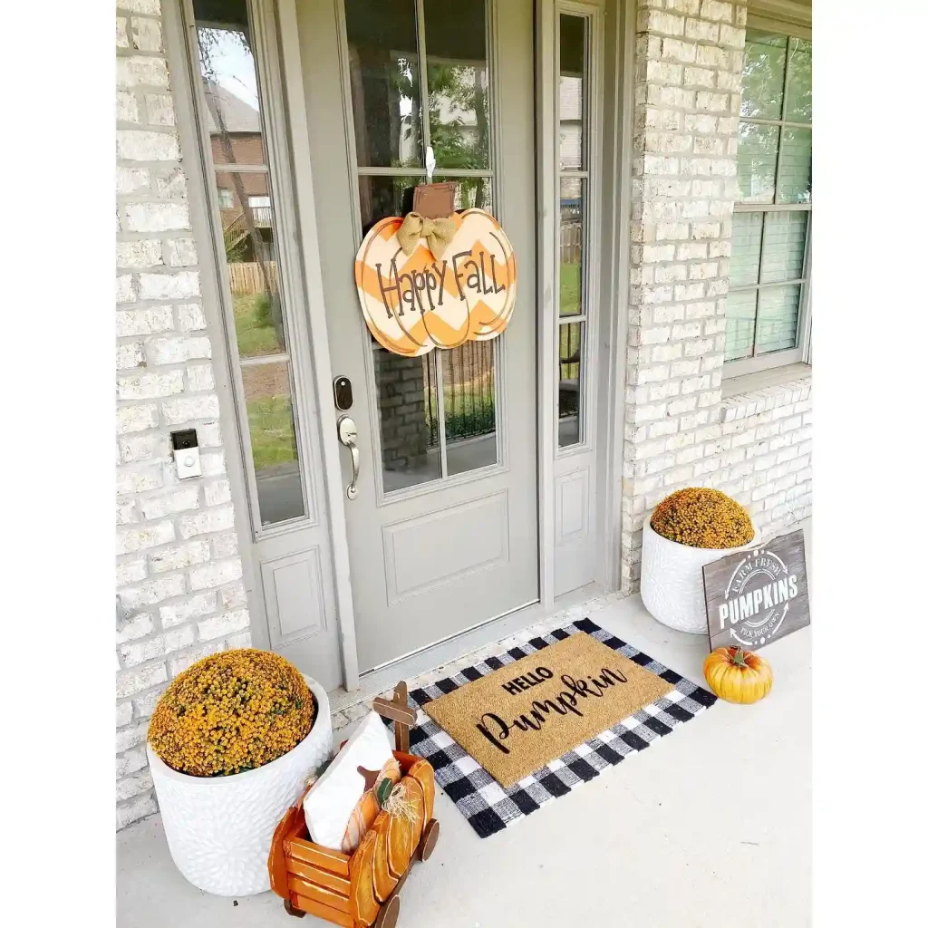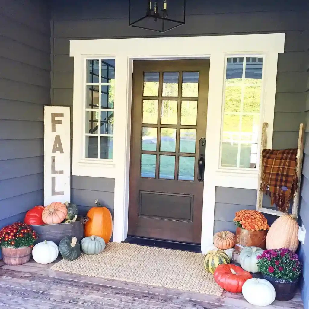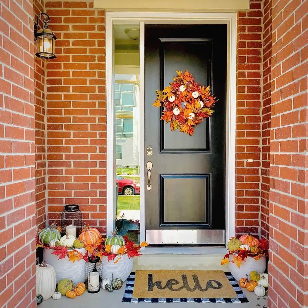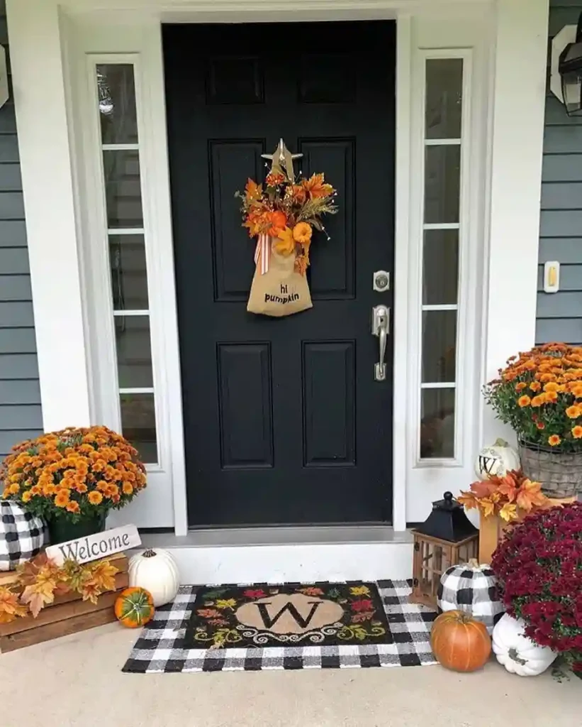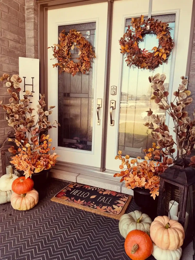 This porch sets the tone for autumn with its classic layered doormat look. A warm woven rug anchors the space, while a “Welcome” mat adds charm on top. Clusters of pumpkins in different sizes line the steps, creating a layered, abundant feel. It’s simple but instantly makes the entrance feel festive.