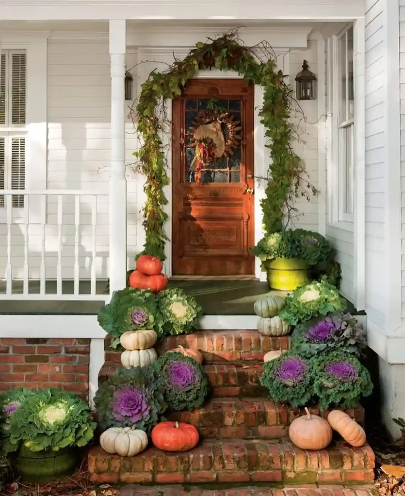 This entryway stands out with vibrant ornamental cabbages, stacked pumpkins, and rustic textures. A leafy garland frames the wooden door beautifully, giving it a rich, harvest-inspired look.
