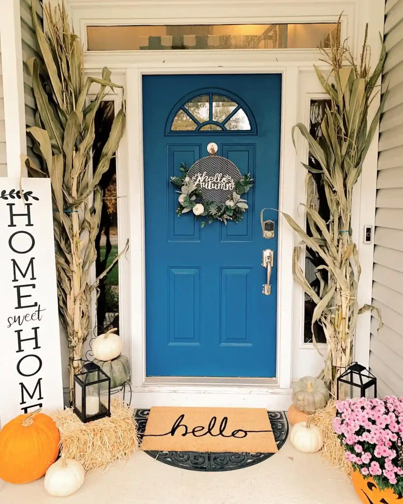 This porch leans into traditional fall elements—corn stalks, hay bales, pumpkins, and lanterns framing the blue door beautifully. A “Hello Autumn” wreath adds a sweet focal point, while the vertical “Home Sweet Home” sign brings farmhouse charm.