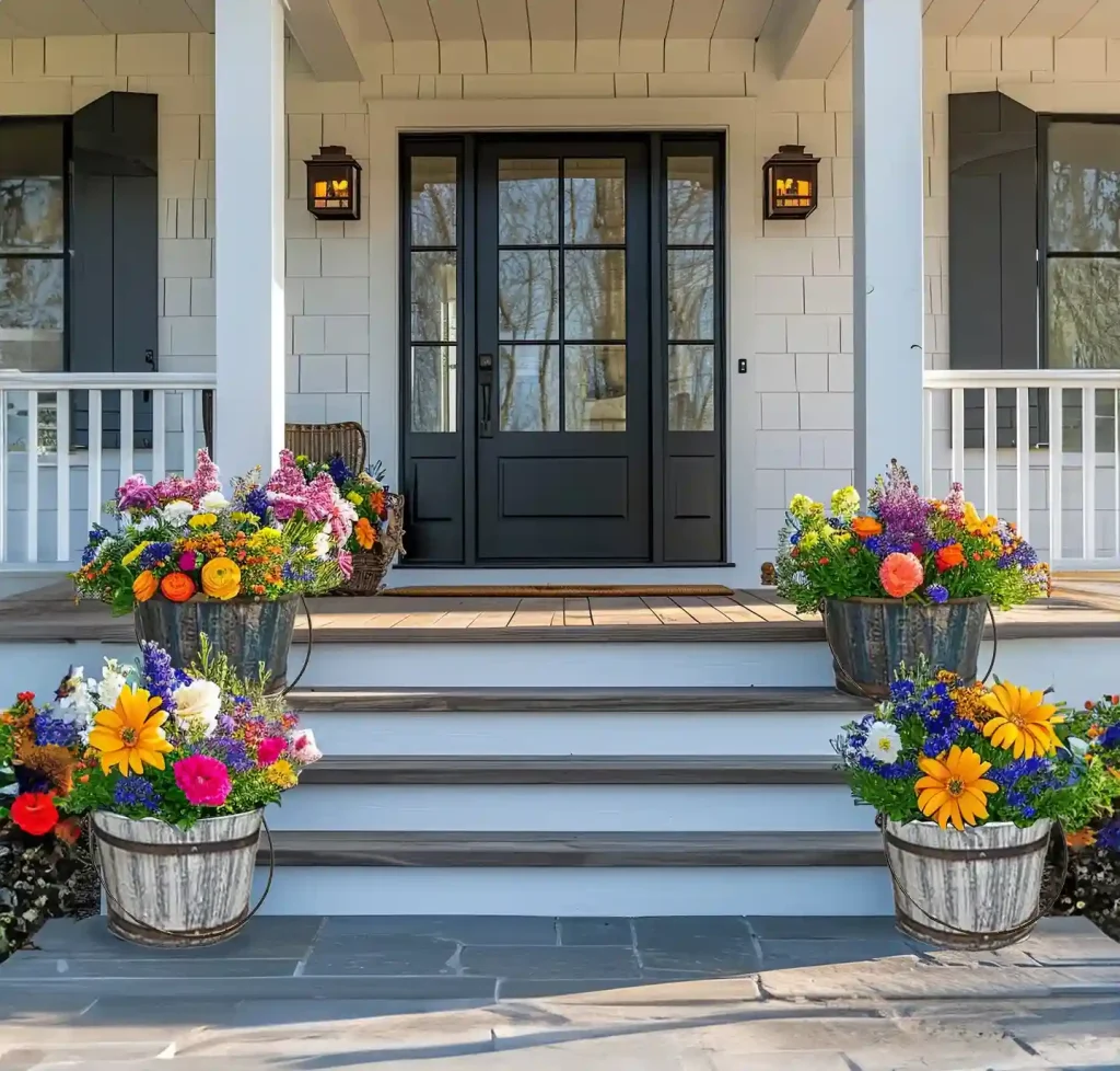 This porch uses vibrant late-summer flowers in galvanized buckets for a cheerful, transitional look. Bright yellows, purples, and oranges frame the dark doors, making it easy to bridge summer and fall decor.