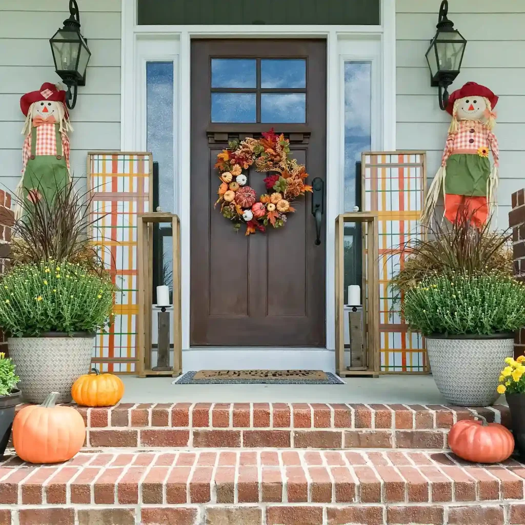 This front door steals attention with a full, textured autumn wreath in warm oranges, yellows, and deep greens. It’s balanced beautifully with a neutral door color, making the wreath pop. Pumpkins gathered near the door complete the classic fall entryway look.