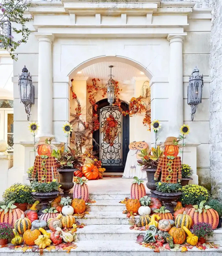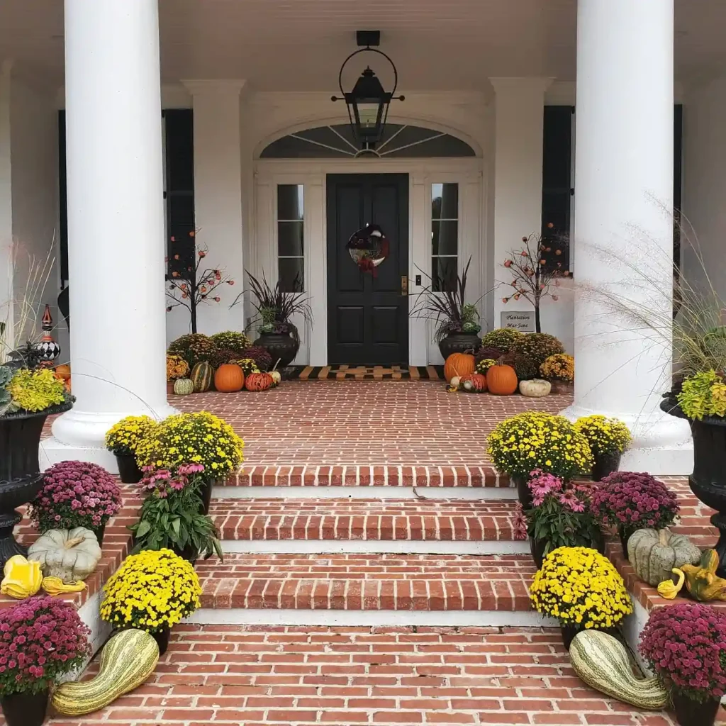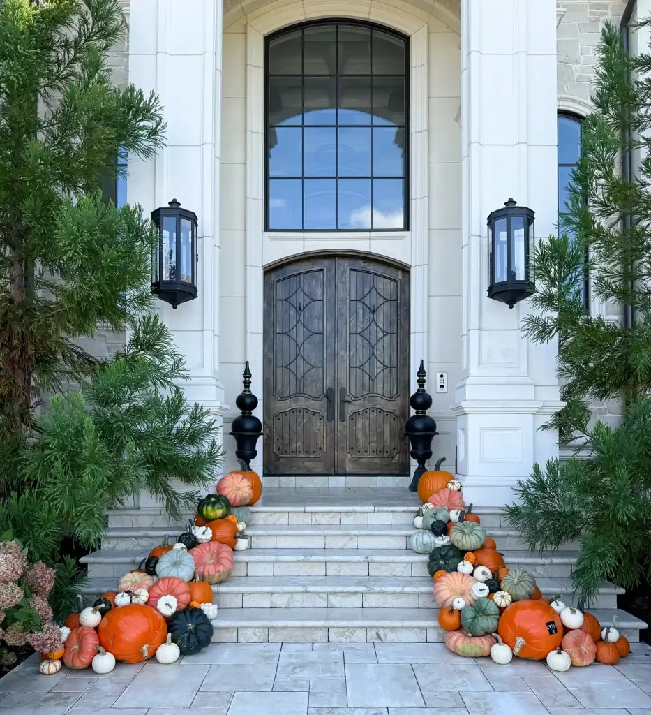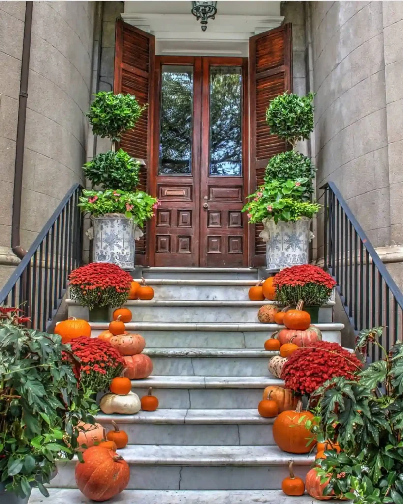 A grand staircase gets a seasonal makeover with clusters of pumpkins in various sizes, nestled beside rich red mums. The symmetry and greenery flanking the doorway give it a stately, elegant fall look that’s both warm and refined.
