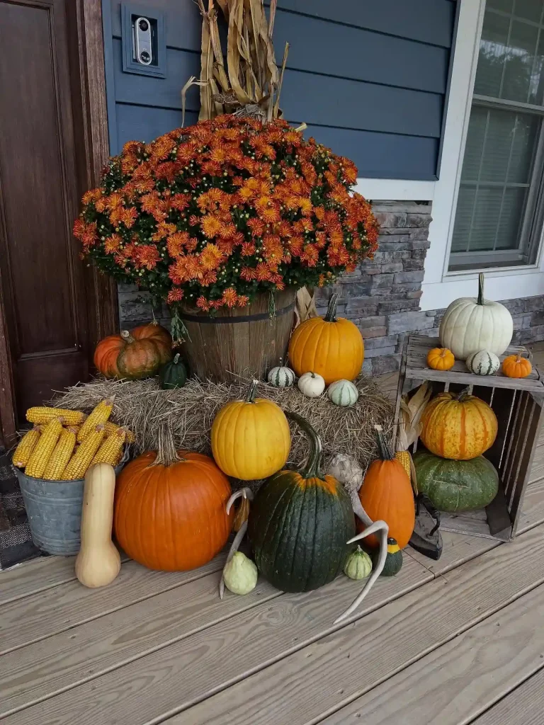 This cozy porch mixes mums, hay bales, corn cobs, and an assortment of pumpkins to create a layered harvest display. It’s rustic, abundant, and full of fall personality.