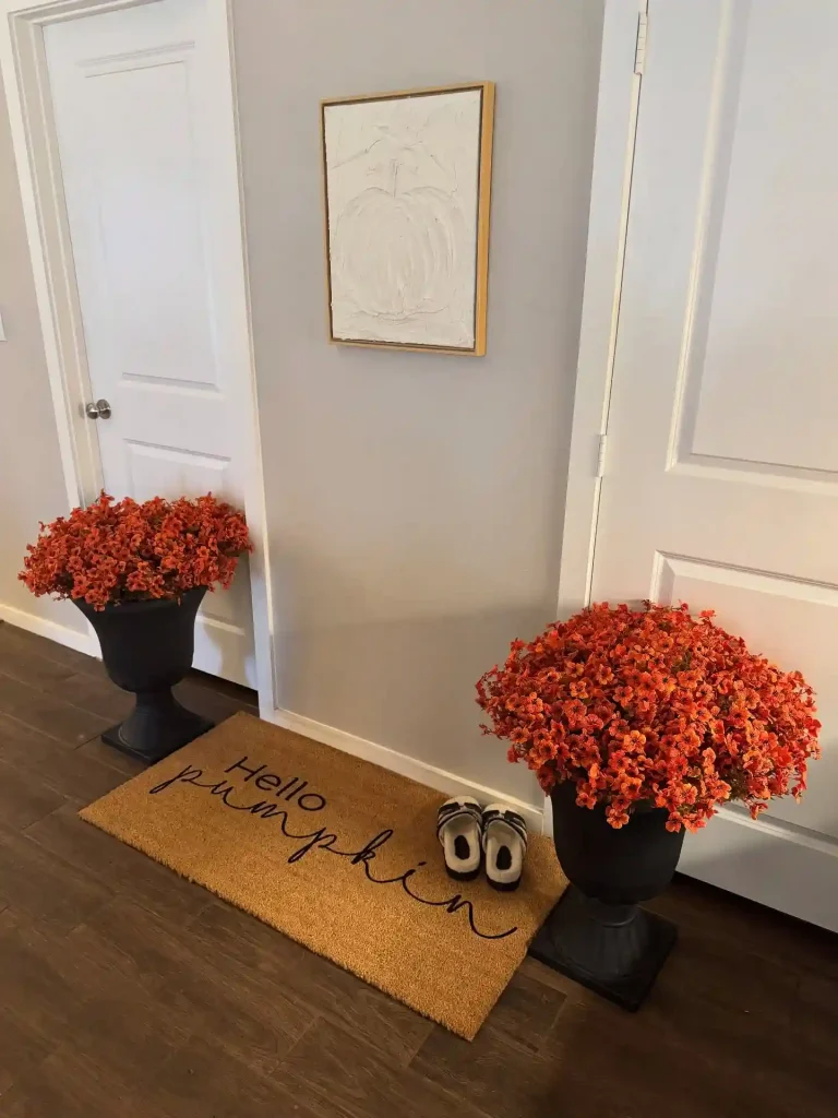 A simple hallway is instantly made festive with a “Hello Pumpkin” doormat and two large urn planters of bright orange mums. It’s a minimal and elegant way to bring fall indoors.