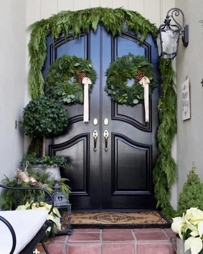 This entry swaps pumpkins for greenery, draping thick garlands and wreaths over striking black double doors. The pinecones and ribbon details add a soft, natural texture, making it a perfect transitional look between fall and winter.