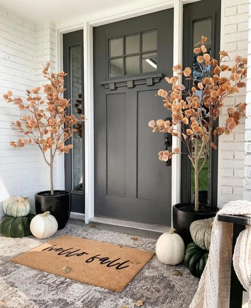 A dark door paired with clean white walls gives a modern contrast. Simple black pots with warm brown branches and a few pumpkins keep this look minimal yet seasonally charming.