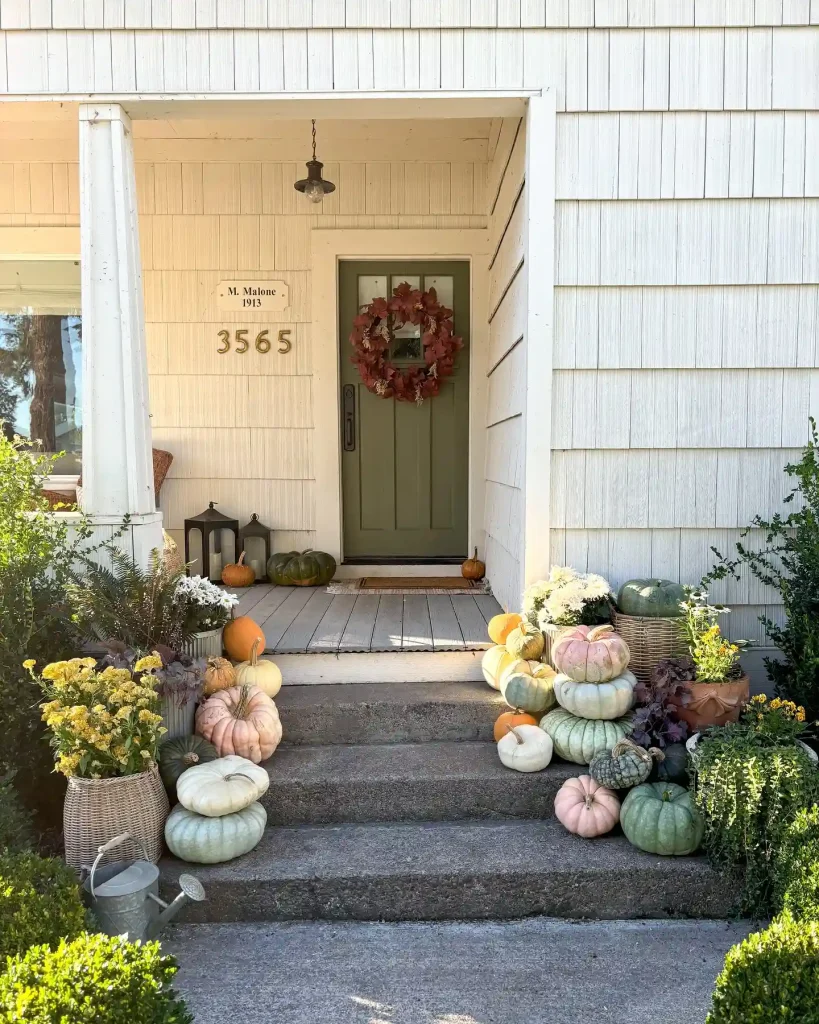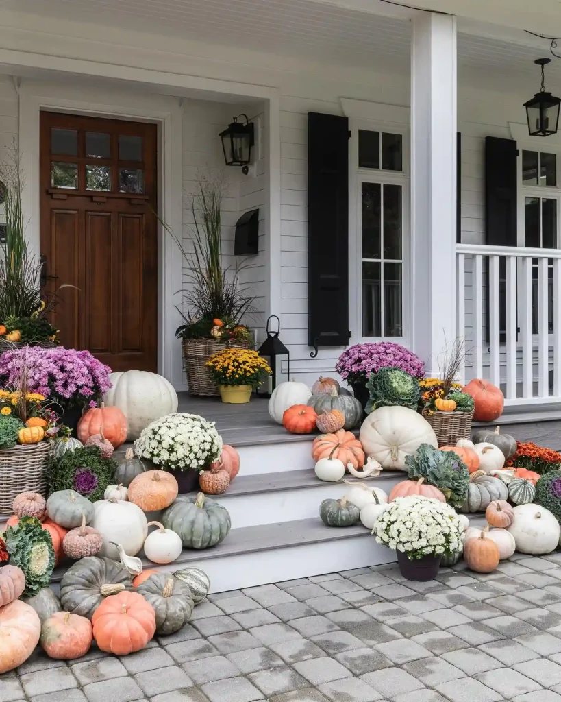 A soft neutral porch turns into a fall wonderland with layers of orange, white, and green pumpkins spilling across the steps. Baskets of mums and cabbages bring texture and variety, creating a charming, collected seasonal display.