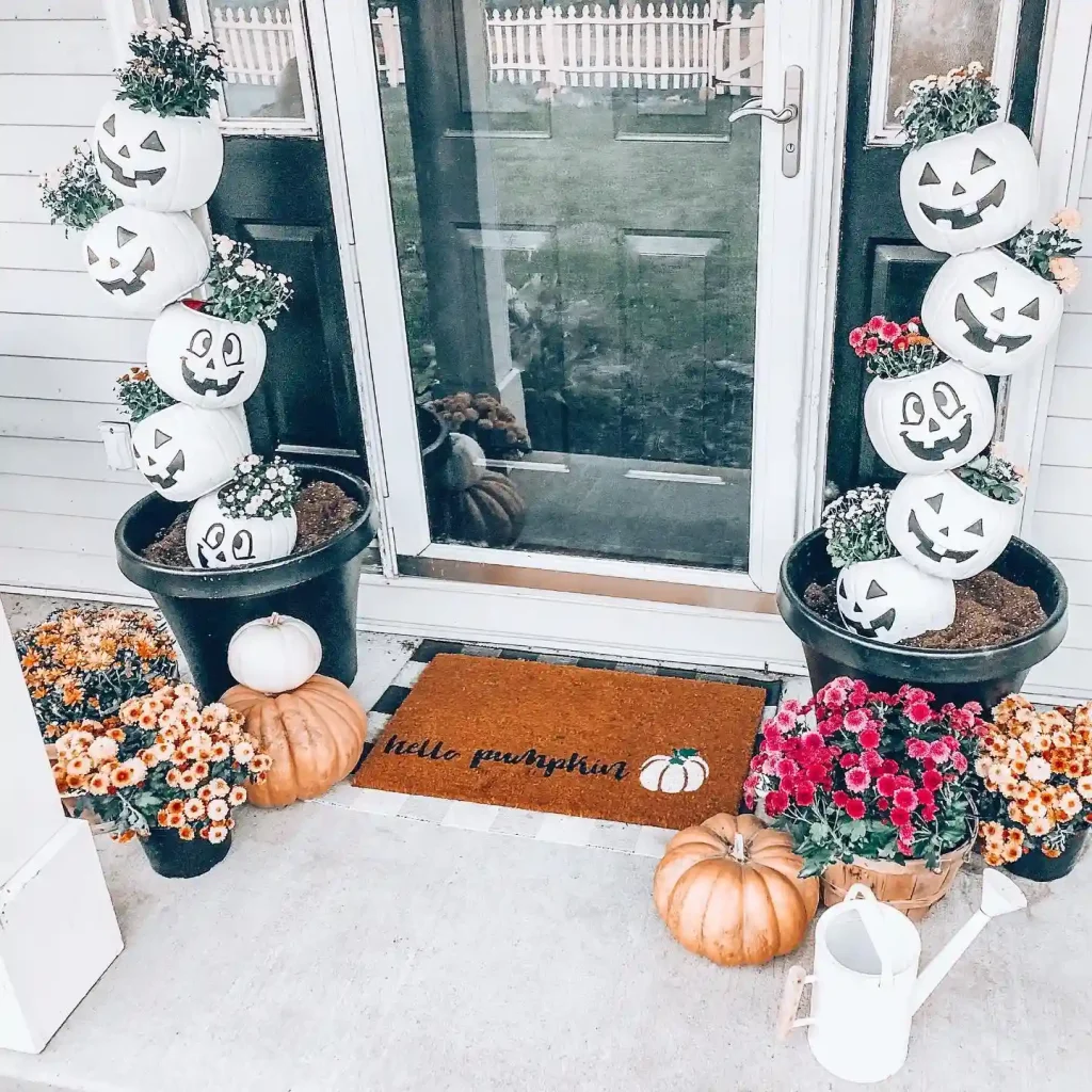 This entryway uses white jack-o’-lantern pumpkins stacked in planters to create a fun and cheerful Halloween-inspired look. Surrounded by blooming mums and a warm “Hello Pumpkin” mat, it’s the perfect mix of playful and cozy fall charm.