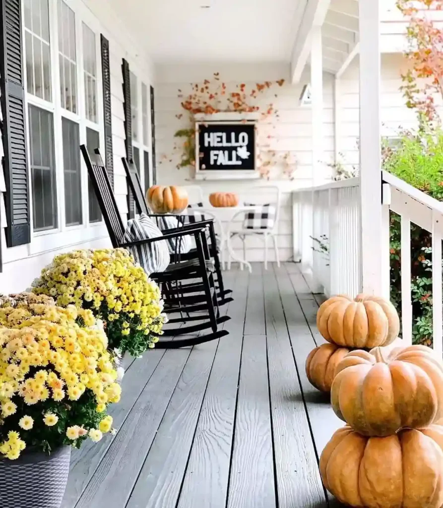 This long porch is full of cozy character — black rocking chairs, buffalo check accents, and soft yellow mums. A stacked pumpkin display by the rail adds a whimsical touch, while the “Hello Fall” sign sets the seasonal tone beautifully.