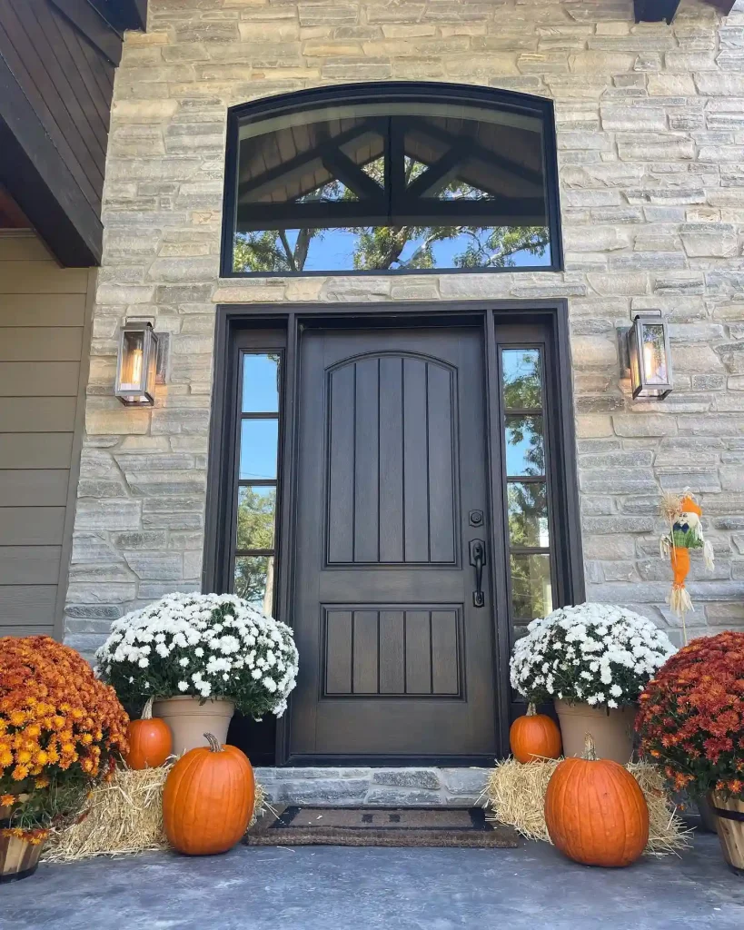 This stone doorway feels warm and rustic with its simple setup hay bales, pumpkins, and full mums in orange and white. It’s minimal but powerful, giving the entry a natural harvest-season welcome.