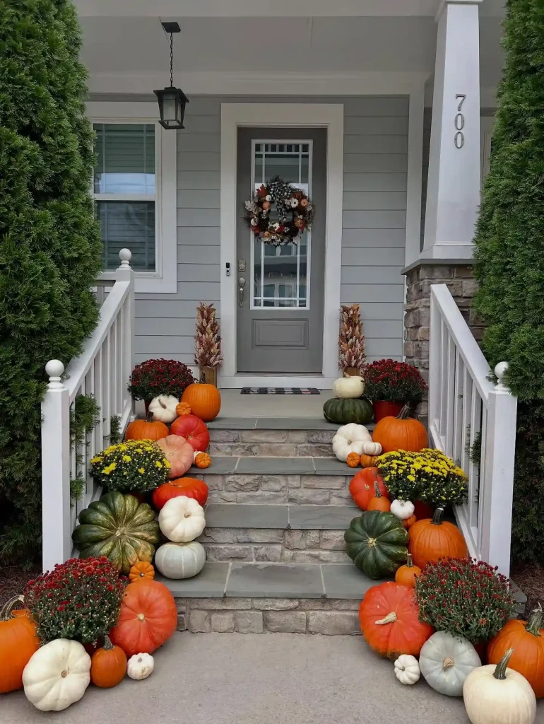 This staircase is packed with pumpkins in every shape, color, and size, framed by bright mums on each side. The grey siding and white railings make the orange hues pop beautifully.
