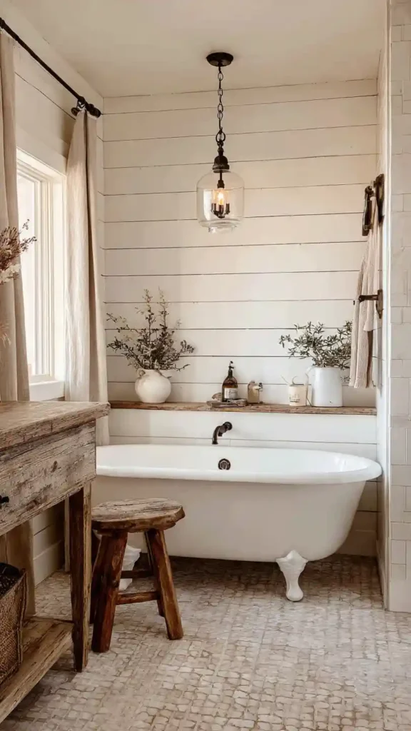 A freestanding tub paired with a small rustic wood stool creates a simple yet functional bathing space. The stool can hold towels, candles, or bath essentials while adding a natural farmhouse touch.