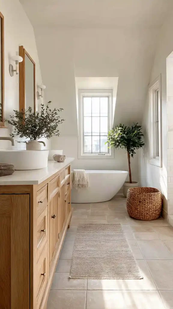 Placing a freestanding bathtub near the window creates a peaceful bathing area while the wood vanity and neutral tile flooring keep the room grounded. The overall result feels bright, fresh, and relaxing.